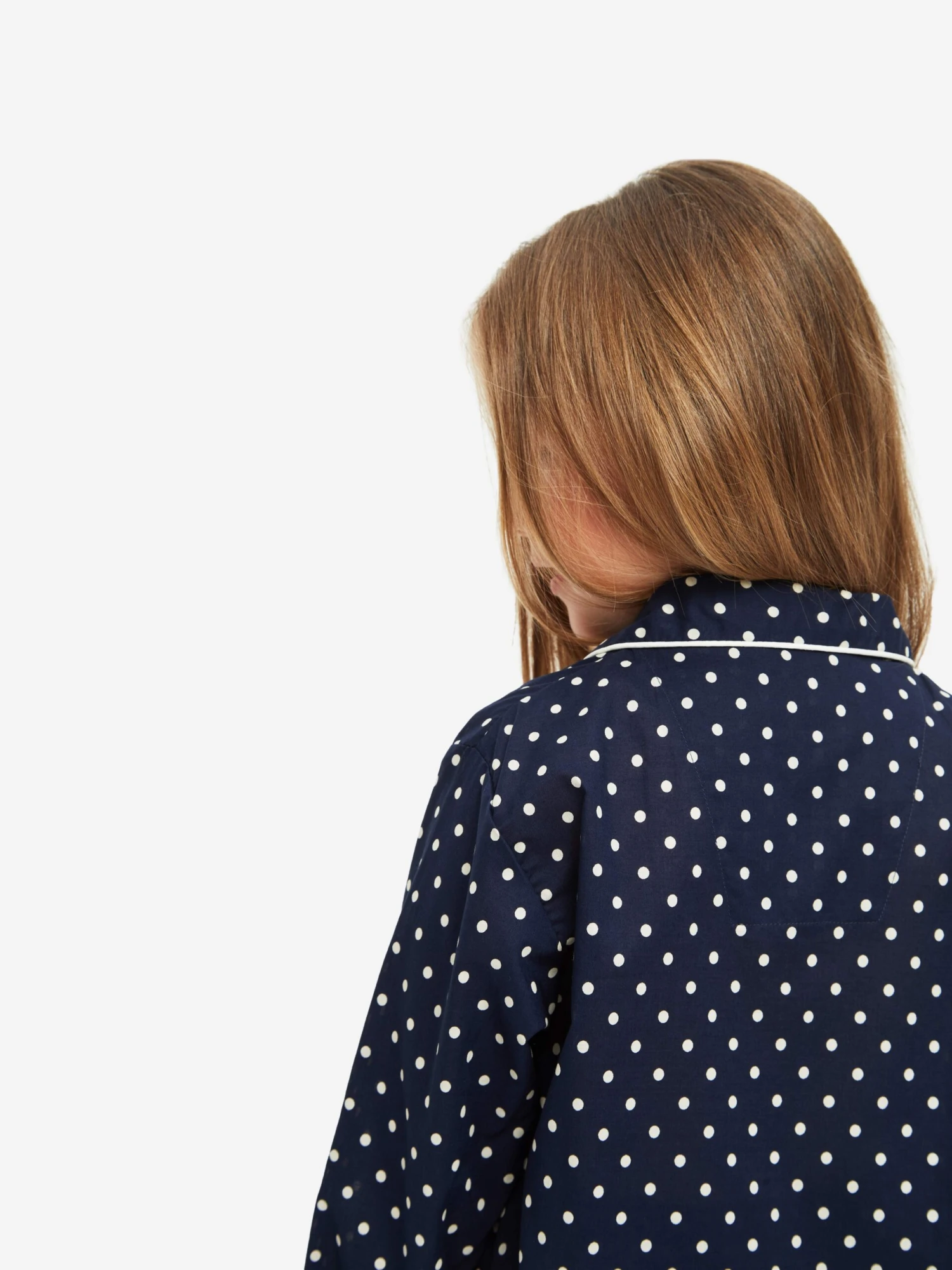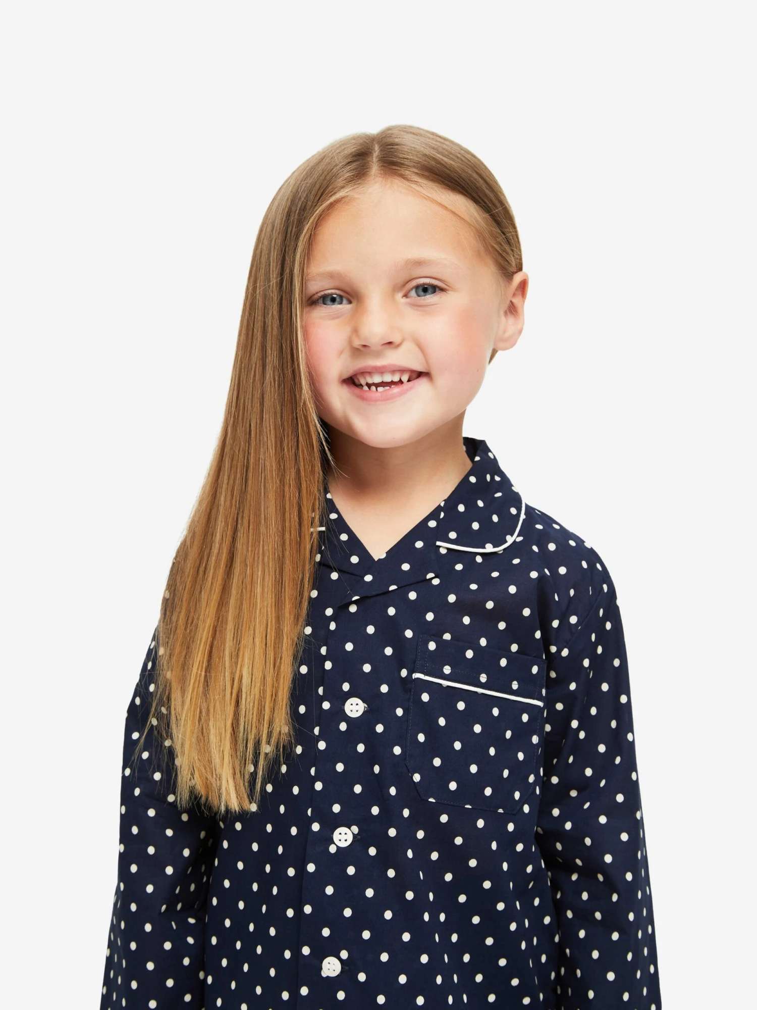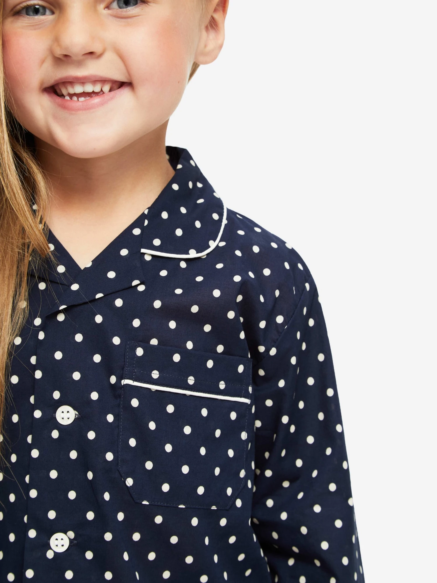 Our Plaza kids’ pyjama is cut from a pure cotton batiste fabric with a large scale polka dot print for a cosy bedtime must-have.