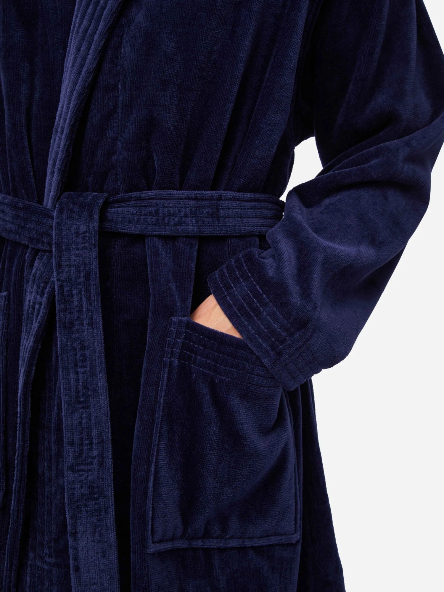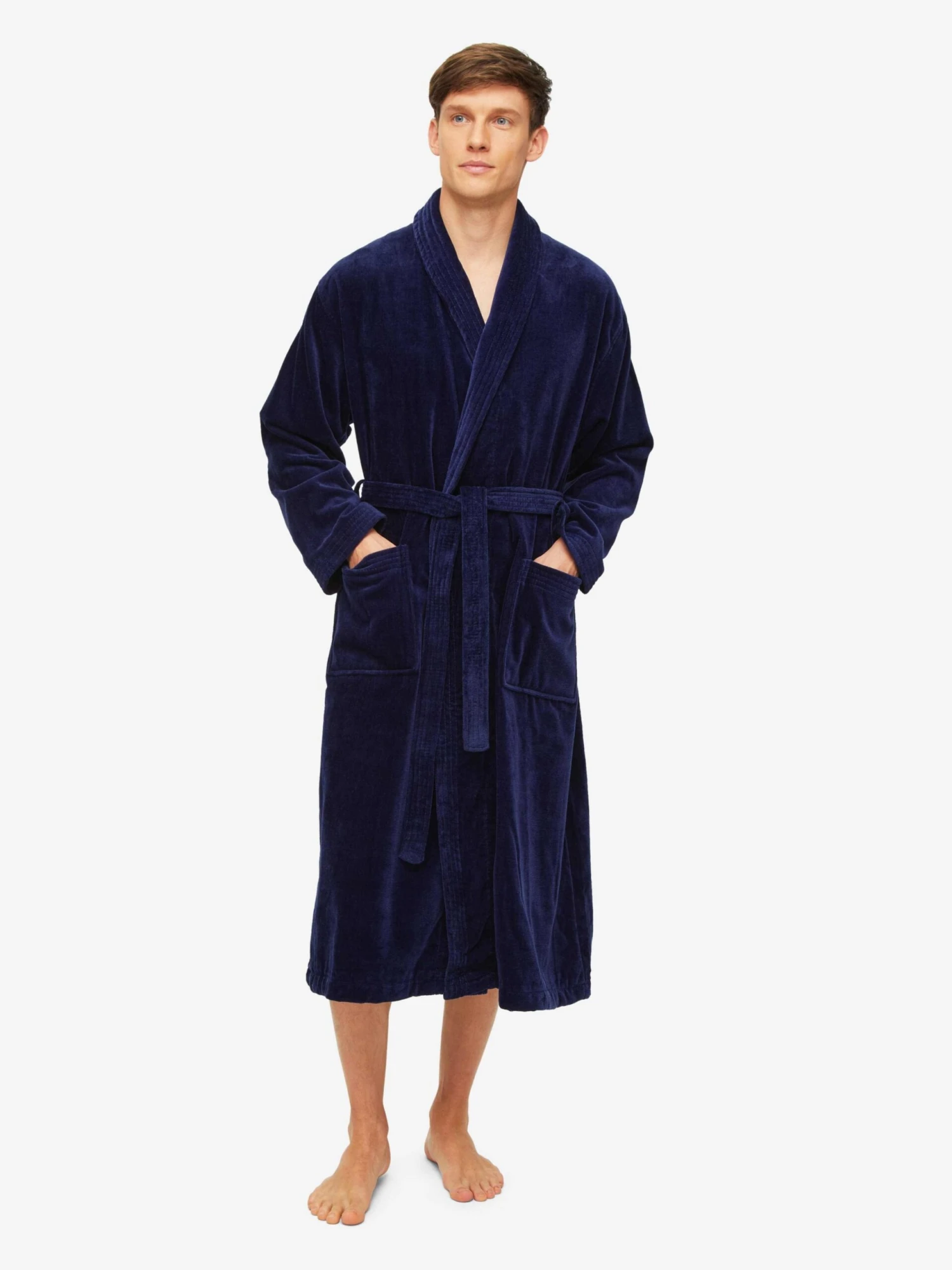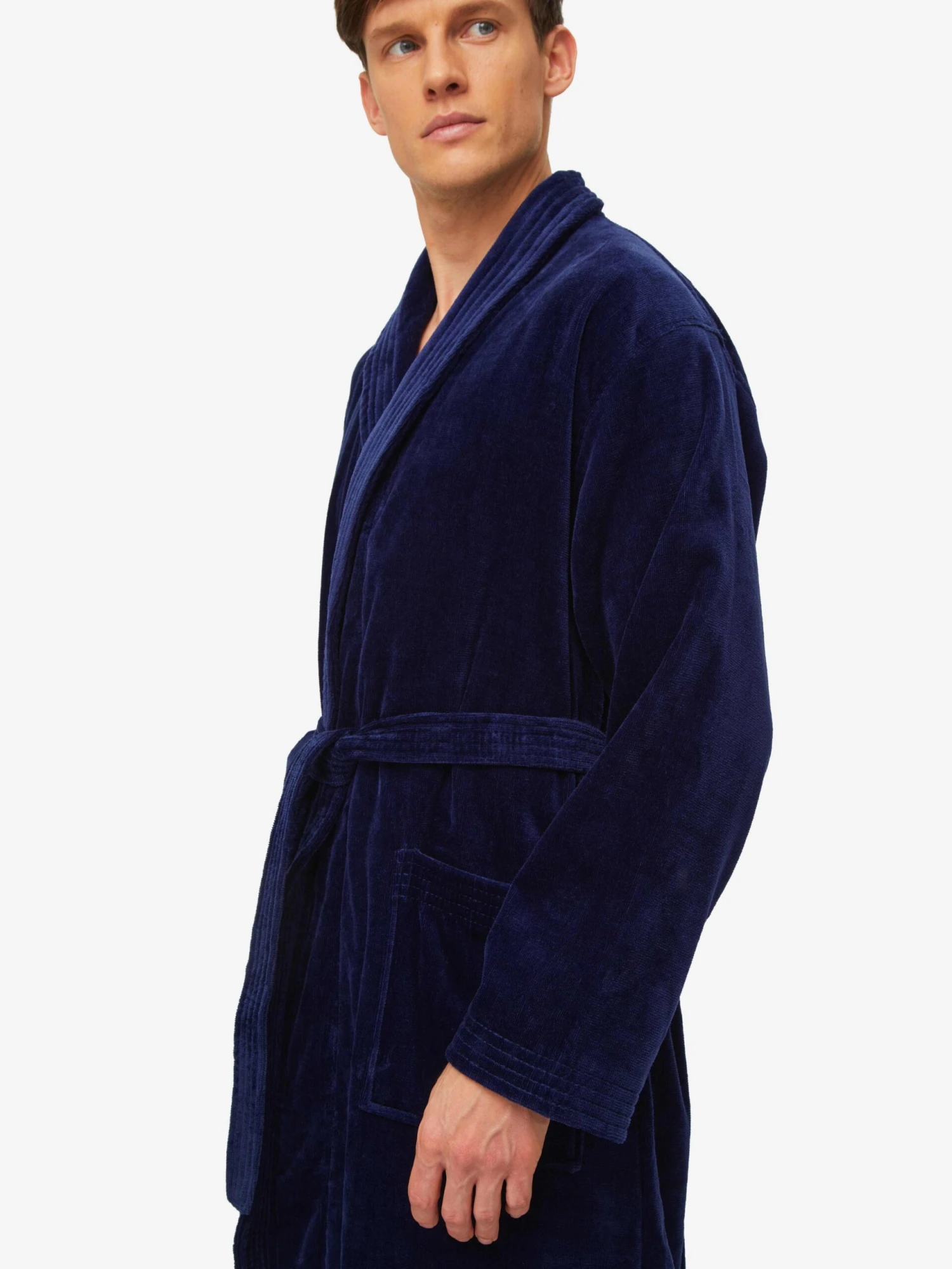 Our Triton bathrobe is a customer favourite, it features a classic shawl collar and two side pockets for practicality while around the house. It’s fastened with a fabric tie belt for the perfect fit.