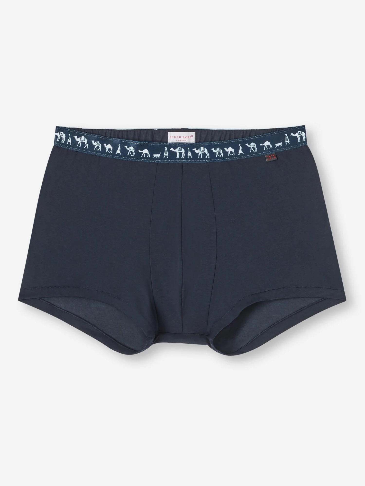 One of our best selling underwear styles, our men’s hipsters are perfect for those who prefer their boxer briefs with shorter legs and our navy Band 62 boxers do just that, combining a closed front with a streamlined, shorter leg. Featuring a design inspired by the Saharan desert with camels and their keepers with Spartacus the cat following behind on the waistband.