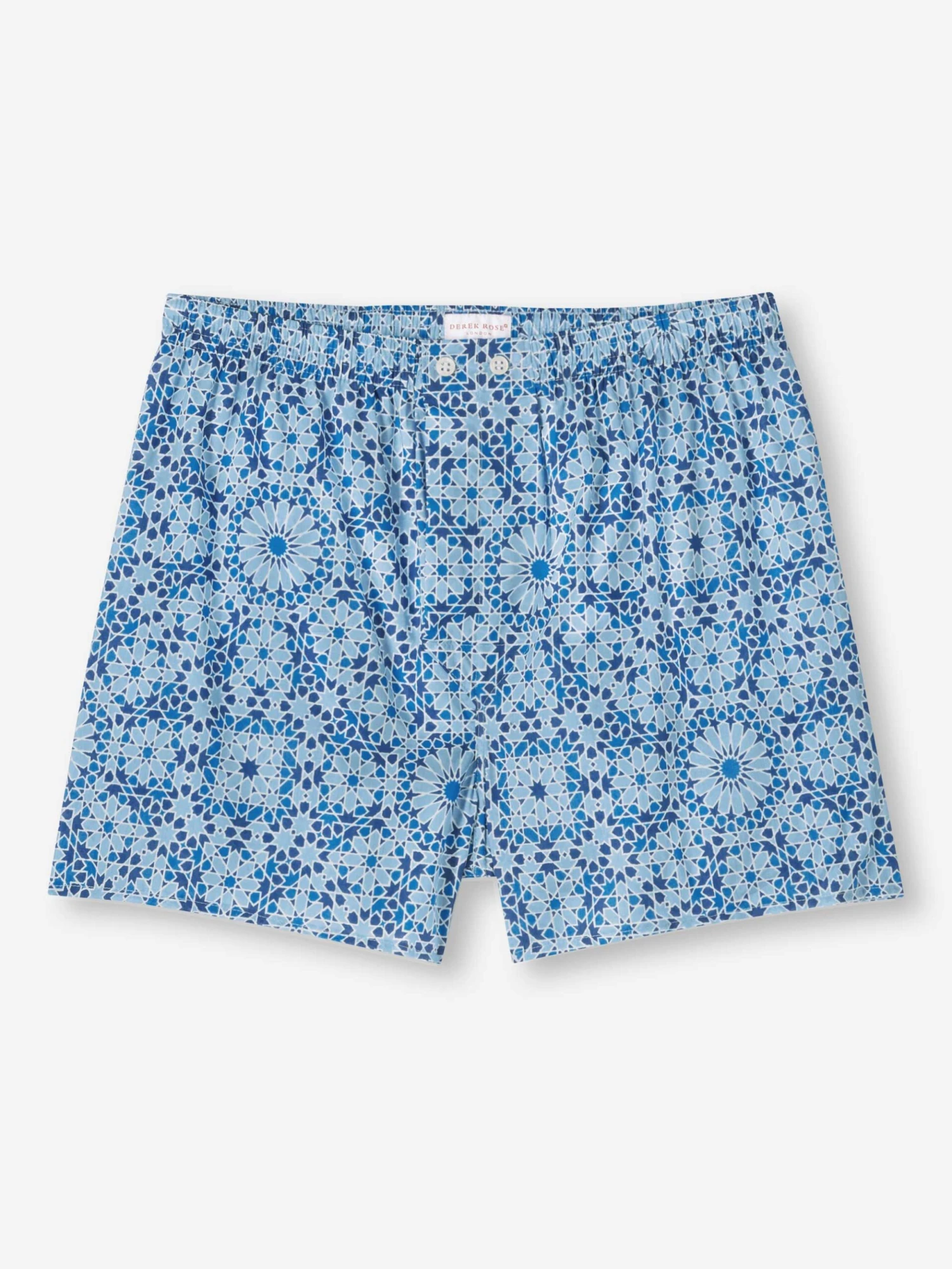 Our seasonal Ledbury 69 boxer shorts design features a hand painted blue geometric print, inspired by Arabic mosaic tiles.