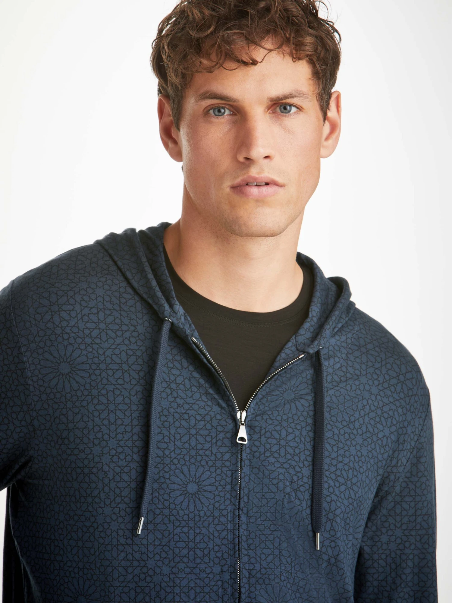 Wash after wash the London 12 navy geometric tile print will maintain its colour and the shape will return to its original design, even if worn all night or folded for a long period.