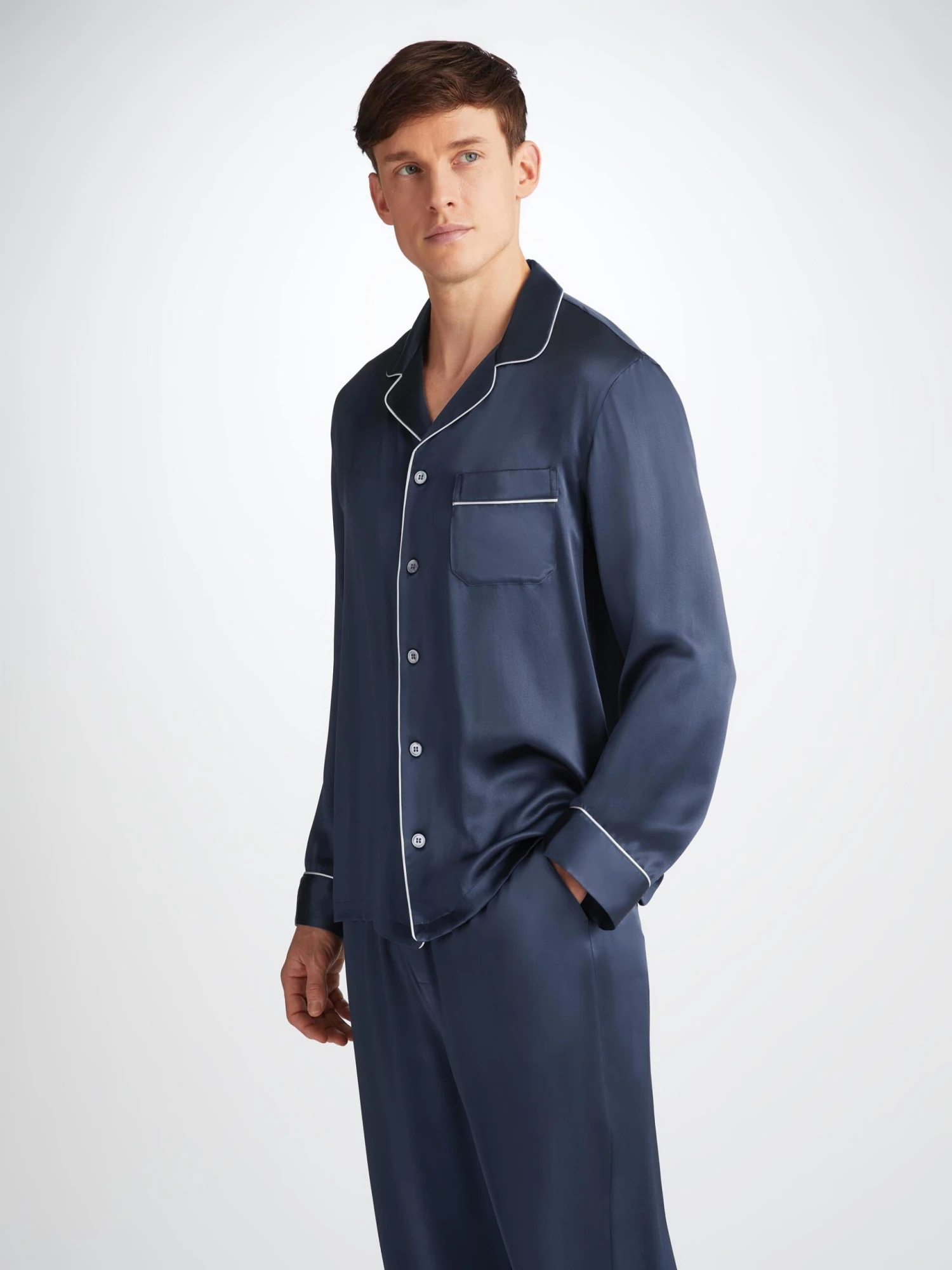 Handmade in our workshop in Cheshire, England, the Bailey silk pyjama is cut by hand to ensure a supremely soft and elegant satin finish. Produced in extremely limited quantities and the result of hours of loving craftwork by our skilled pattern cutters and seamstresses, you’re sure to feel like royalty while lounging at home in our comfortable and beautiful silk sleepwear.