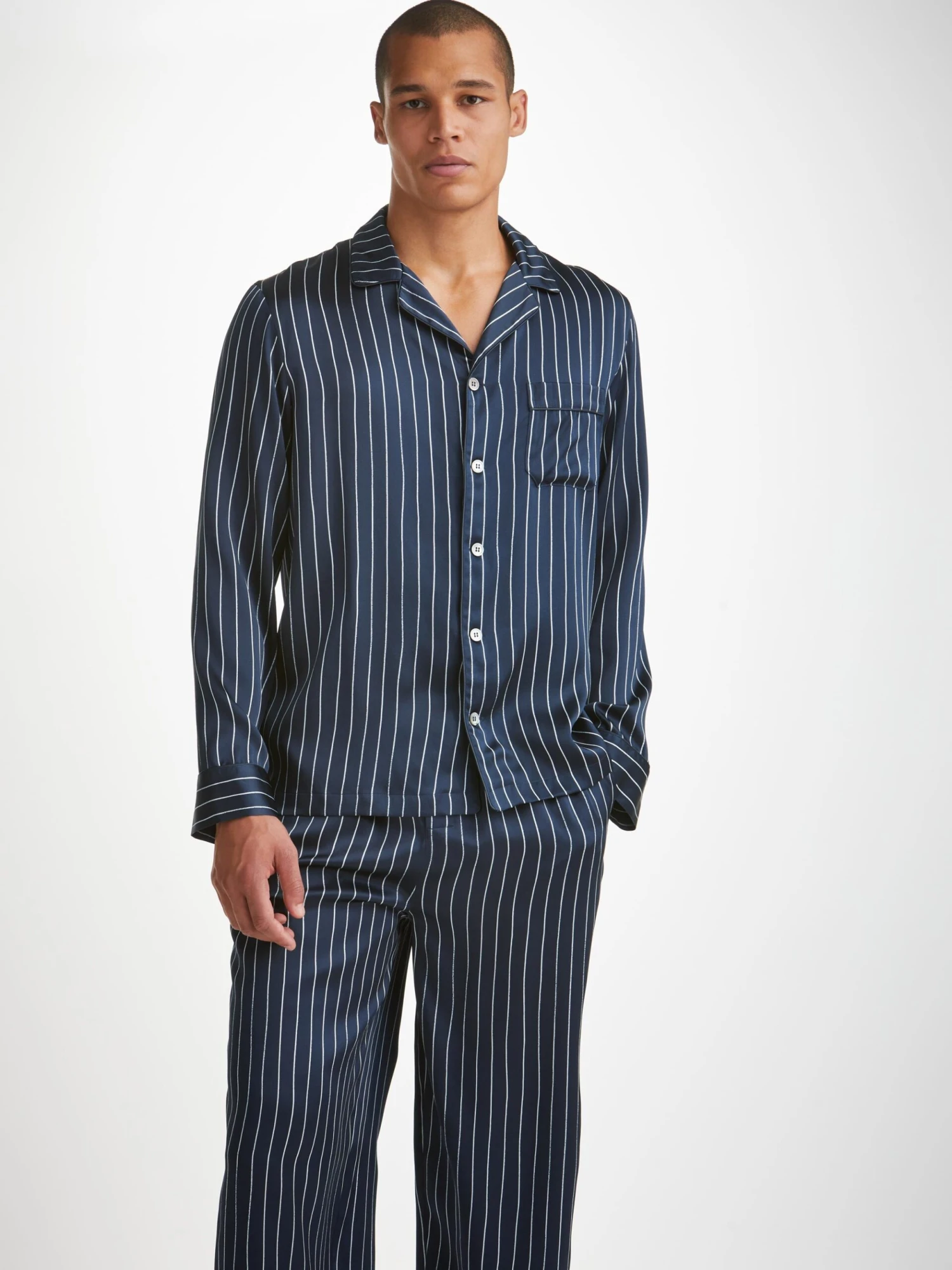 Sourced from Italy and handmade in our workshop in England, nothing matches the look and feel of our elegant silks in a navy, complete with a hand drawn white classic pinstripe.