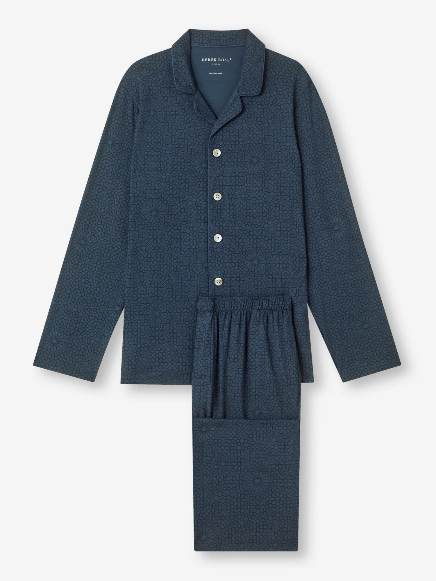 Wash after wash the London 12 geometric tile print in navy will maintain its colour and the shape will return to its original design, even if worn all-night or folded for a long period.