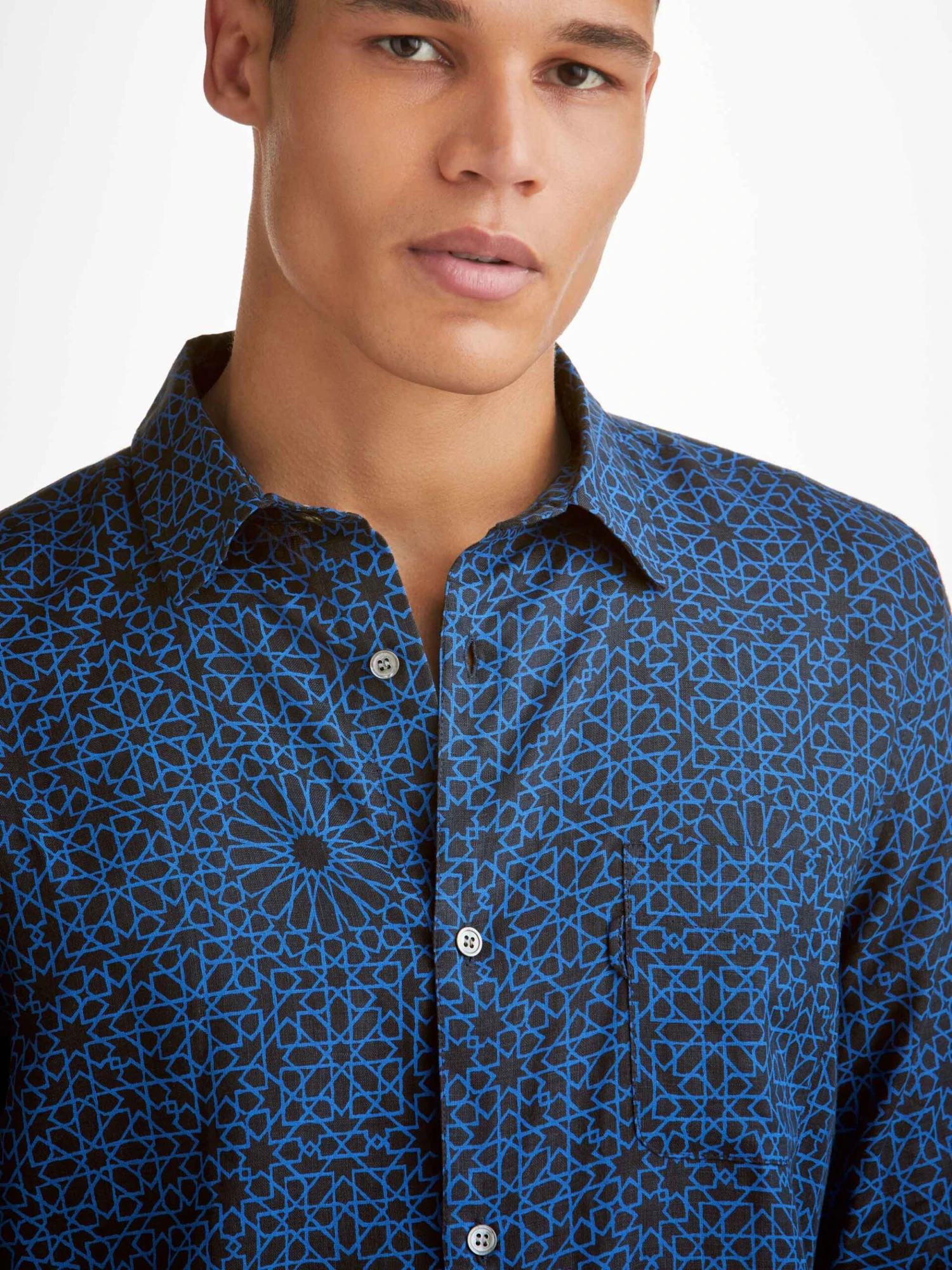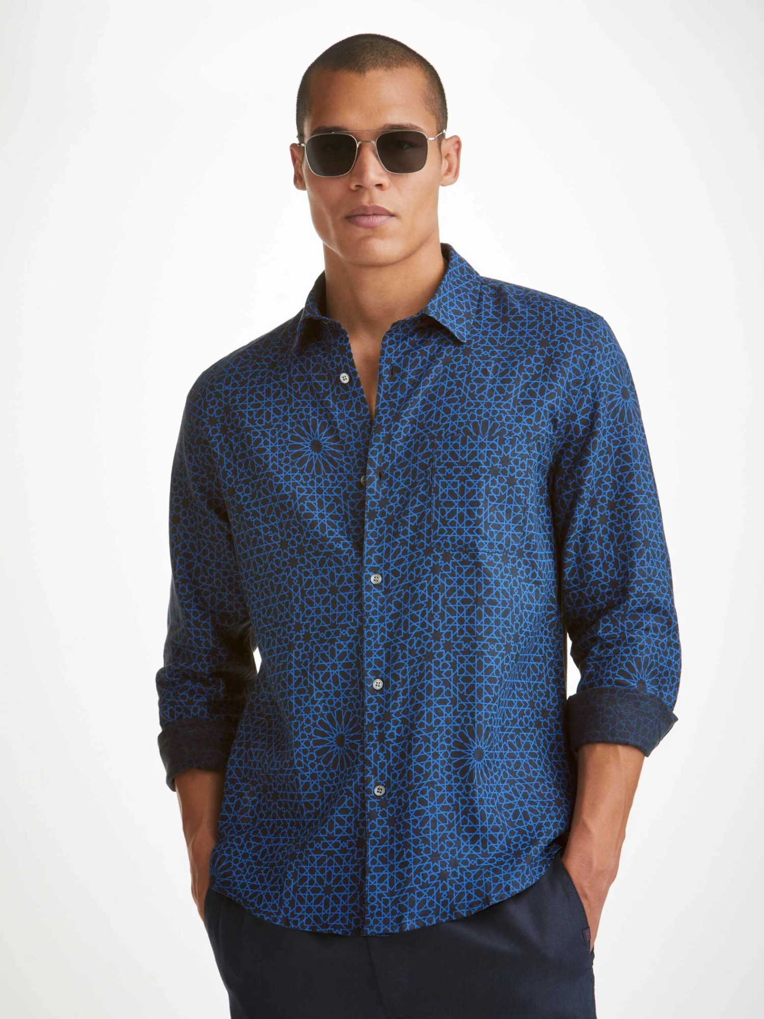 For a final touch of luxe, the navy print inspired by geometric Arabic mosaic tiles is finished with mother of pearl buttons throughout and our minimalist rose logo label at the hem. There’s also a handy ‘locker’ loop on the back for you to hang your shirt up when changing.