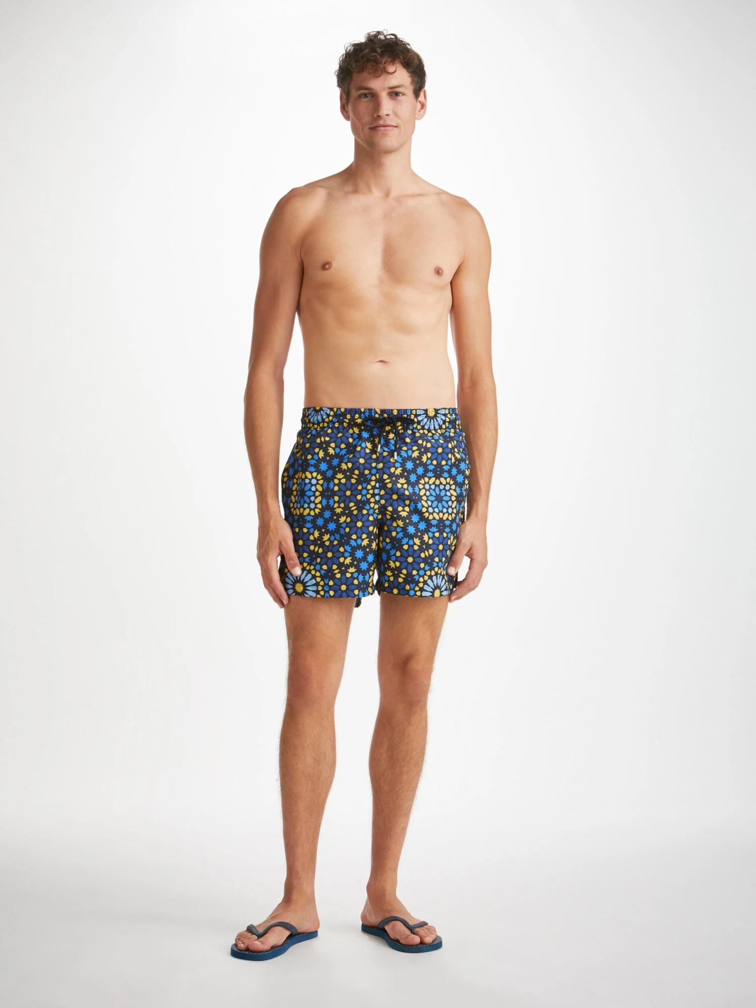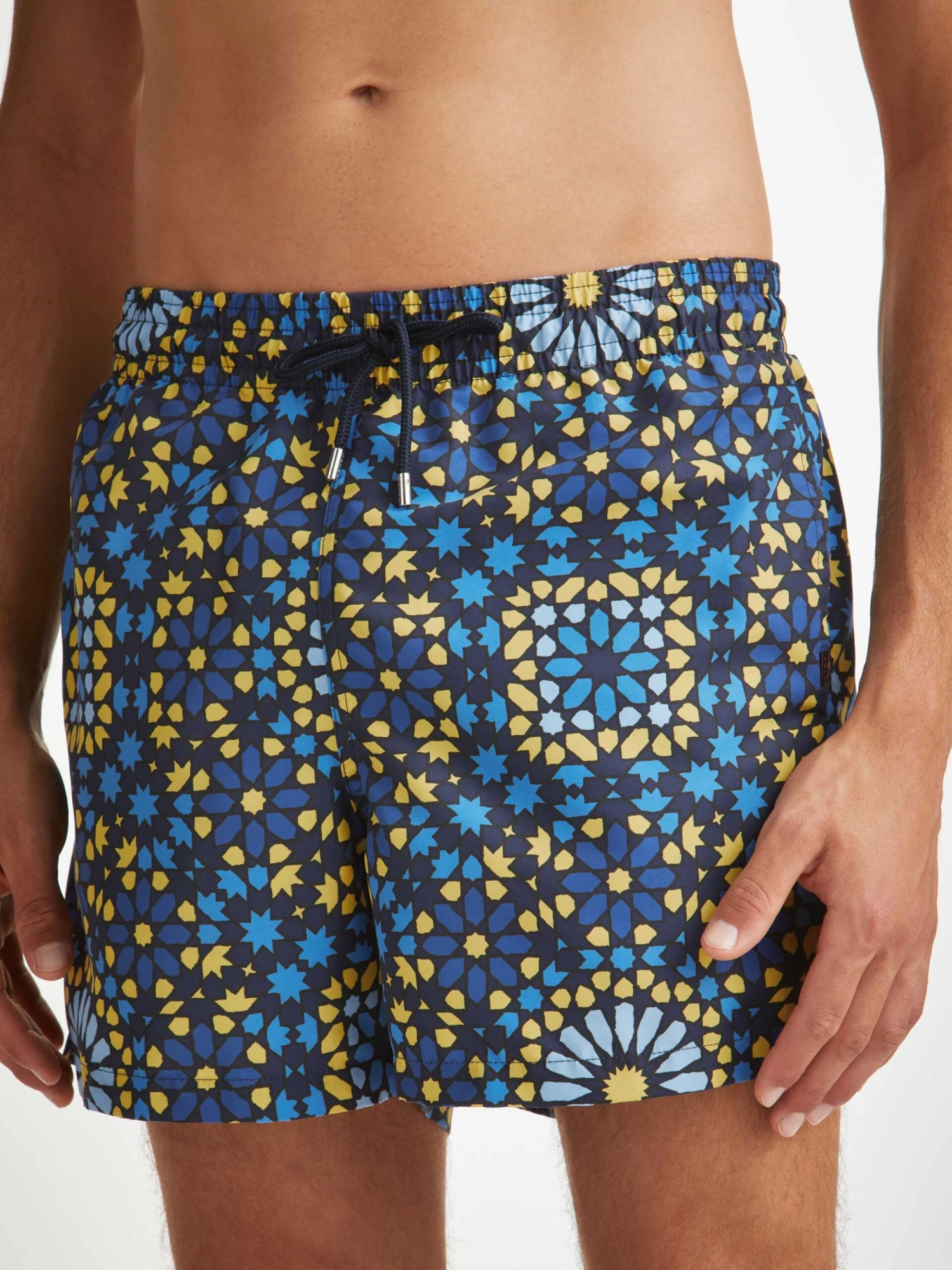 Designed for a relaxed look, our classic style swimming trunk has a fully elasticated waistband and drawstring tie for the perfect fit. The braided drawstring ends are complemented with metal aglets for a luxe finish and the back of the swim shorts feature matching metal eyelets for easy air and water drainage. Boasting a mosaic tile print in our seasonal colour palette.