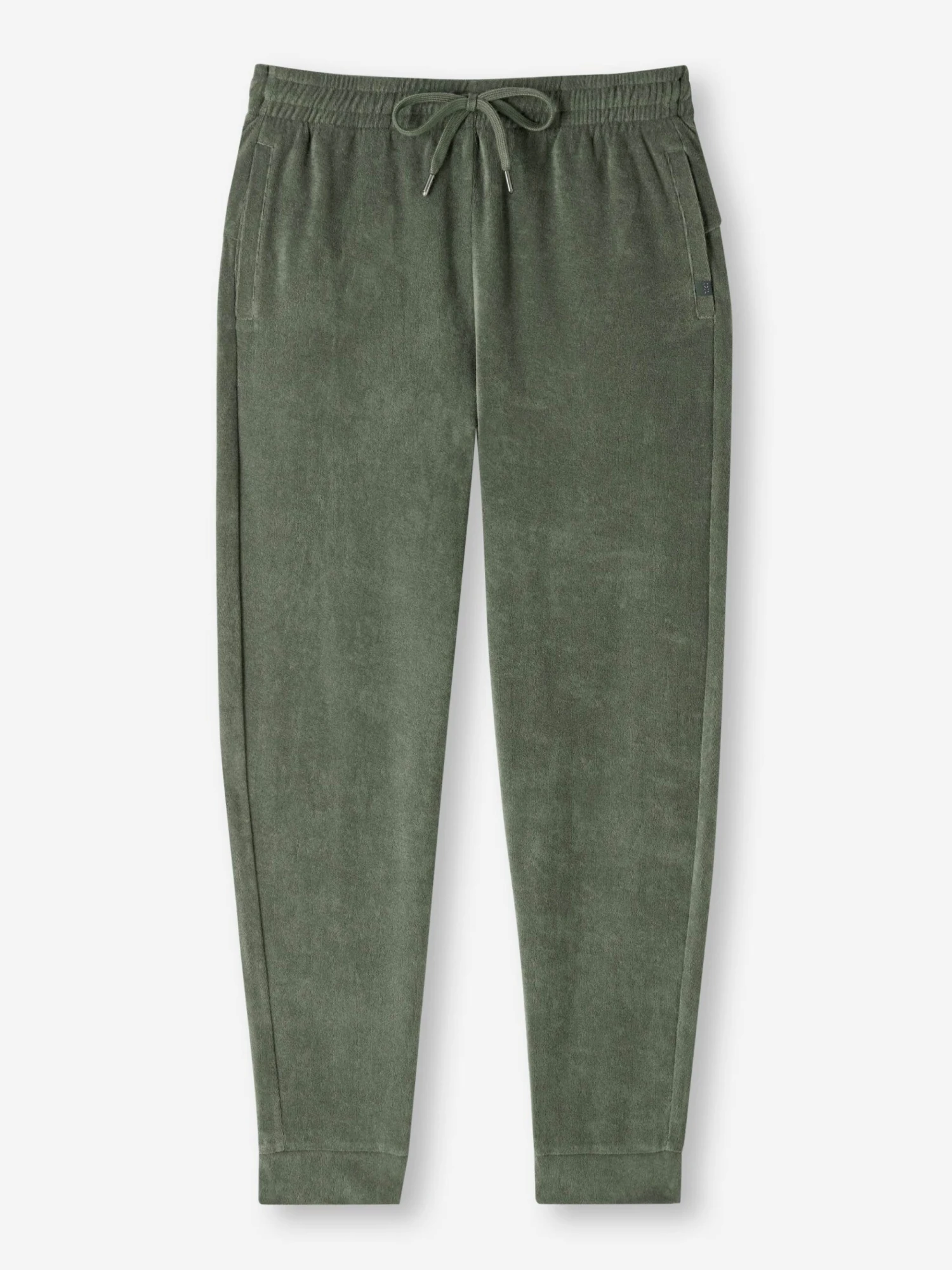 Made with high quality towelling cotton for a truly luxurious handle, small innovative touches such as a curved back yoke, elasticated waistband with a cotton drawcord and self fabric cuffs elevate the Isaac green sweatpants into a wardrobe must-have. All our sweatpants come with a handy zipped back pocket for your possessions too.