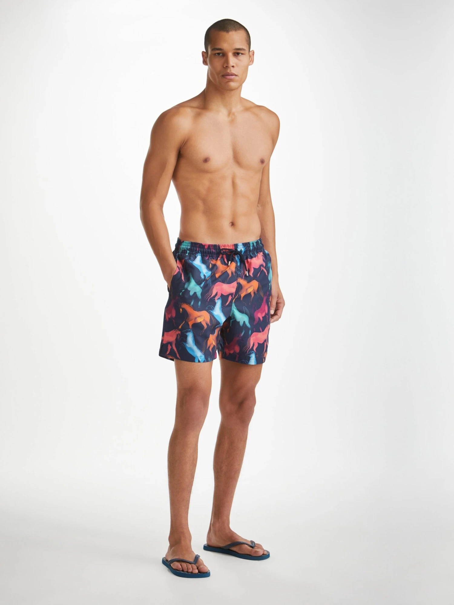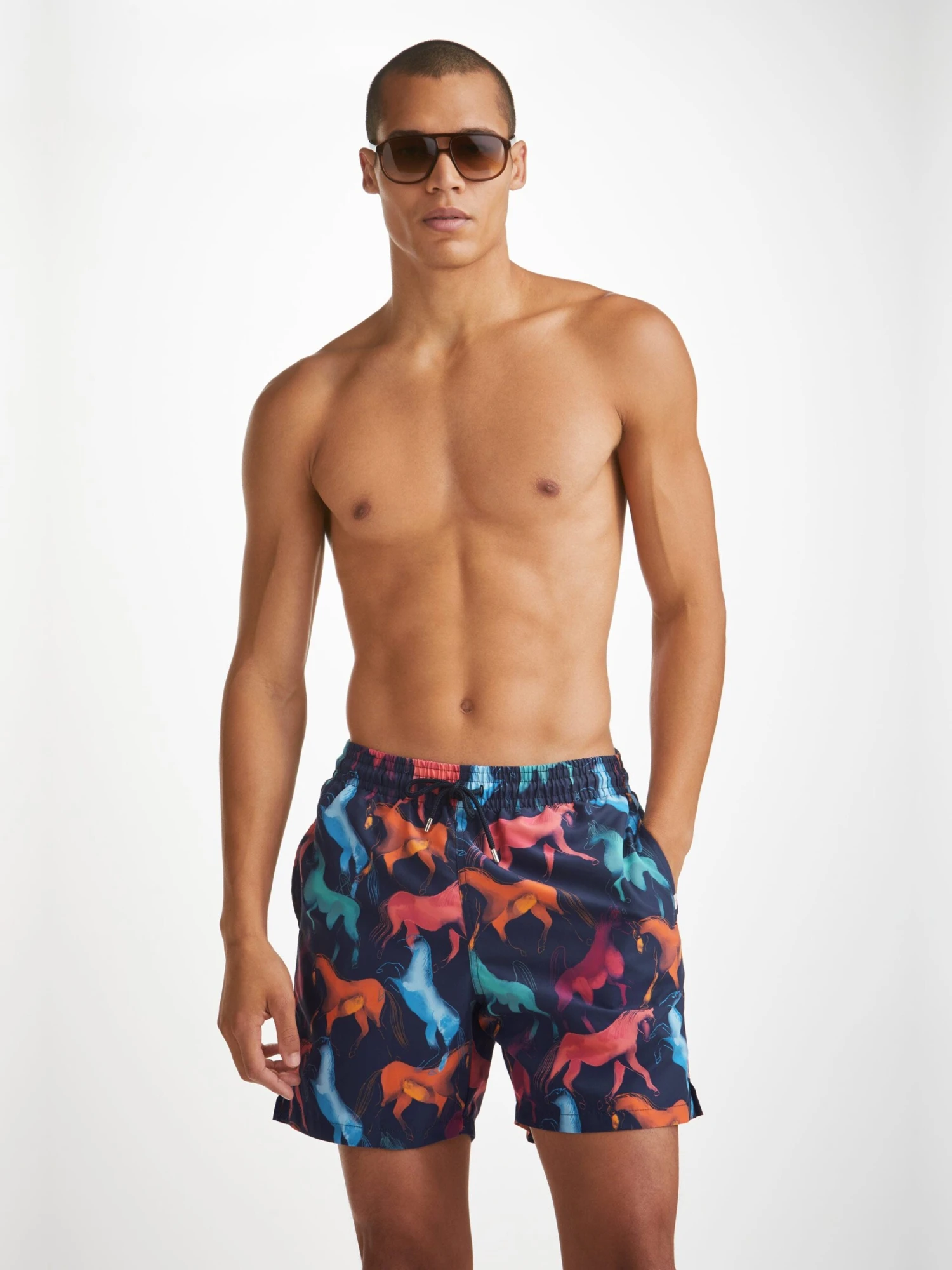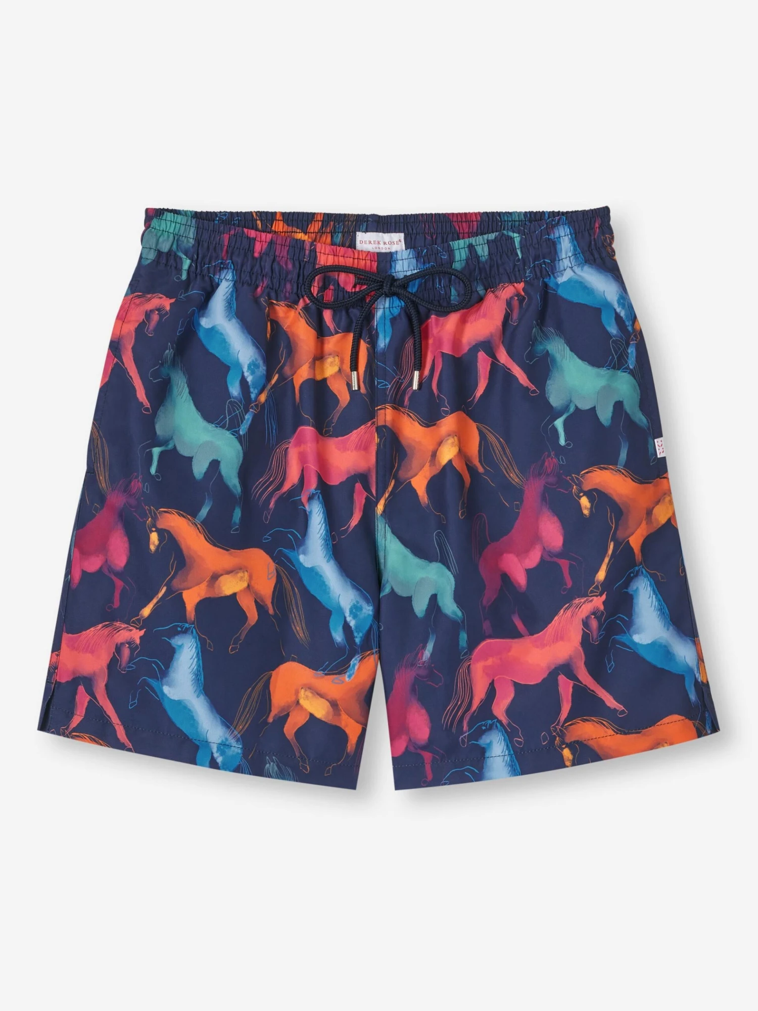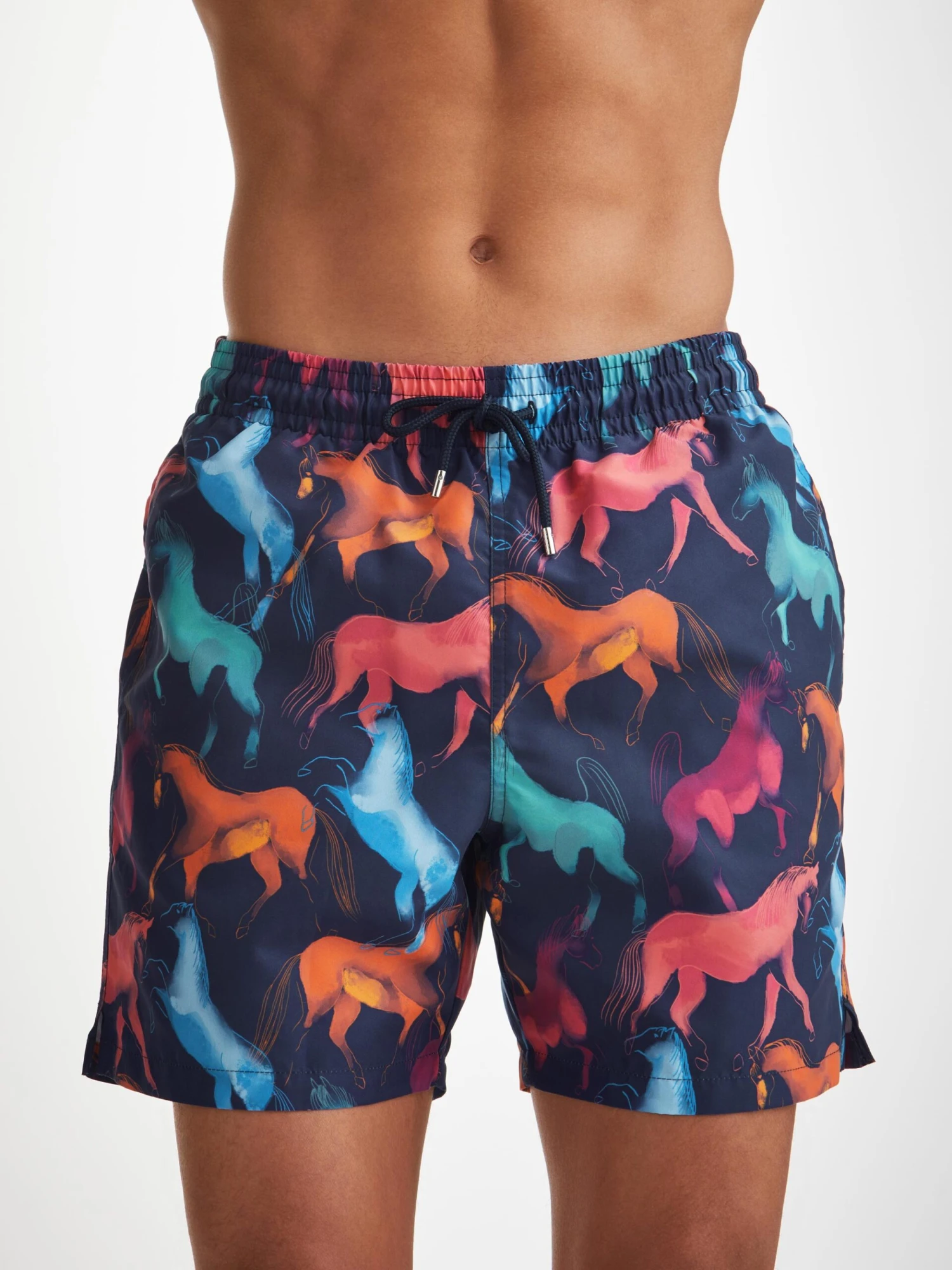 Designed for a relaxed look, our hand drawn multicoloured wild horse print classic style swimming trunk has a fully elasticated waistband and drawstring tie for the perfect fit. The braided drawstring ends are complemented with metal aglets for a luxe finish and the back of the swim shorts feature matching metal eyelets for easy air and water drainage.