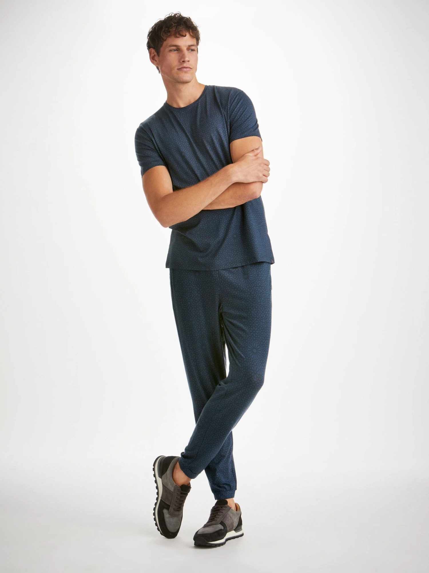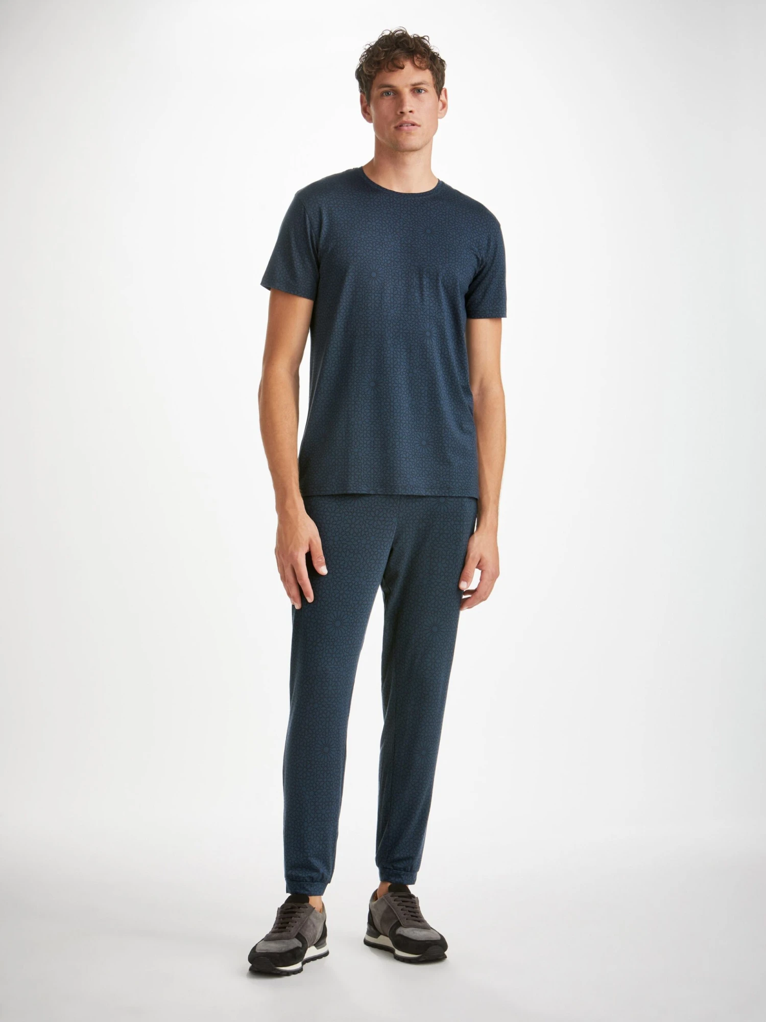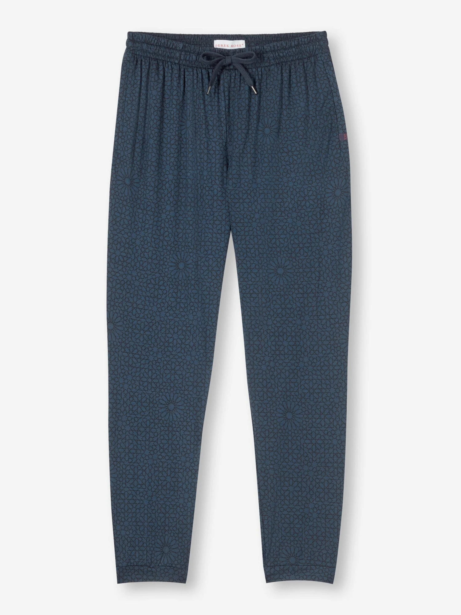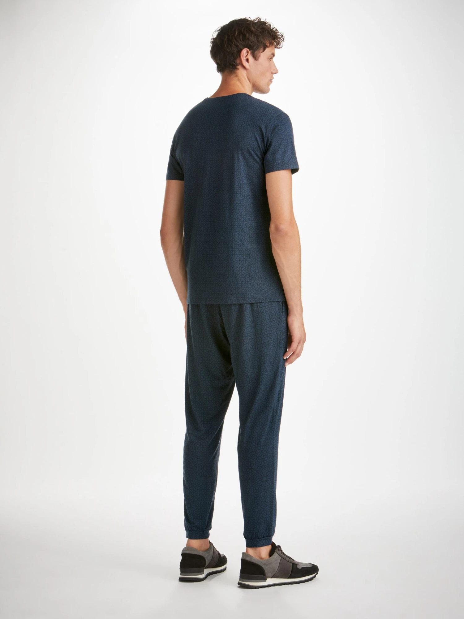 Our London 12 jersey track pants feature an all-over navy geometric tile print for a luxurious twist on classic jersey.