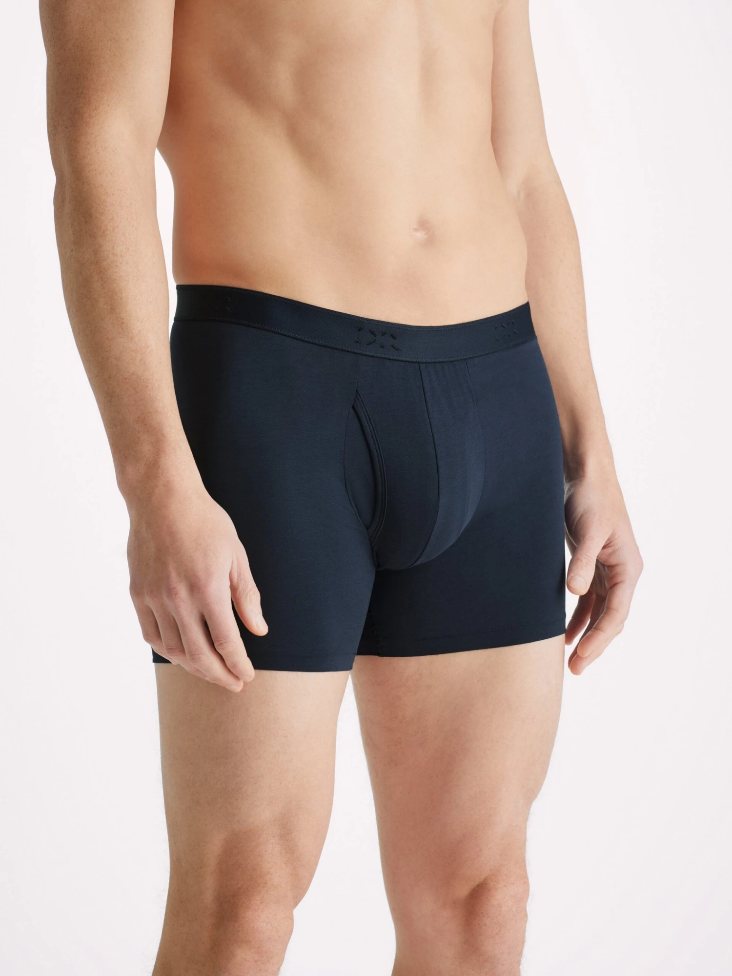 Our Jack trunks in navy blue are cut for a streamlined, classic look with a fitted shape, classic open front and a longer leg. A fabric-covered waistband provides gentle skin contact.