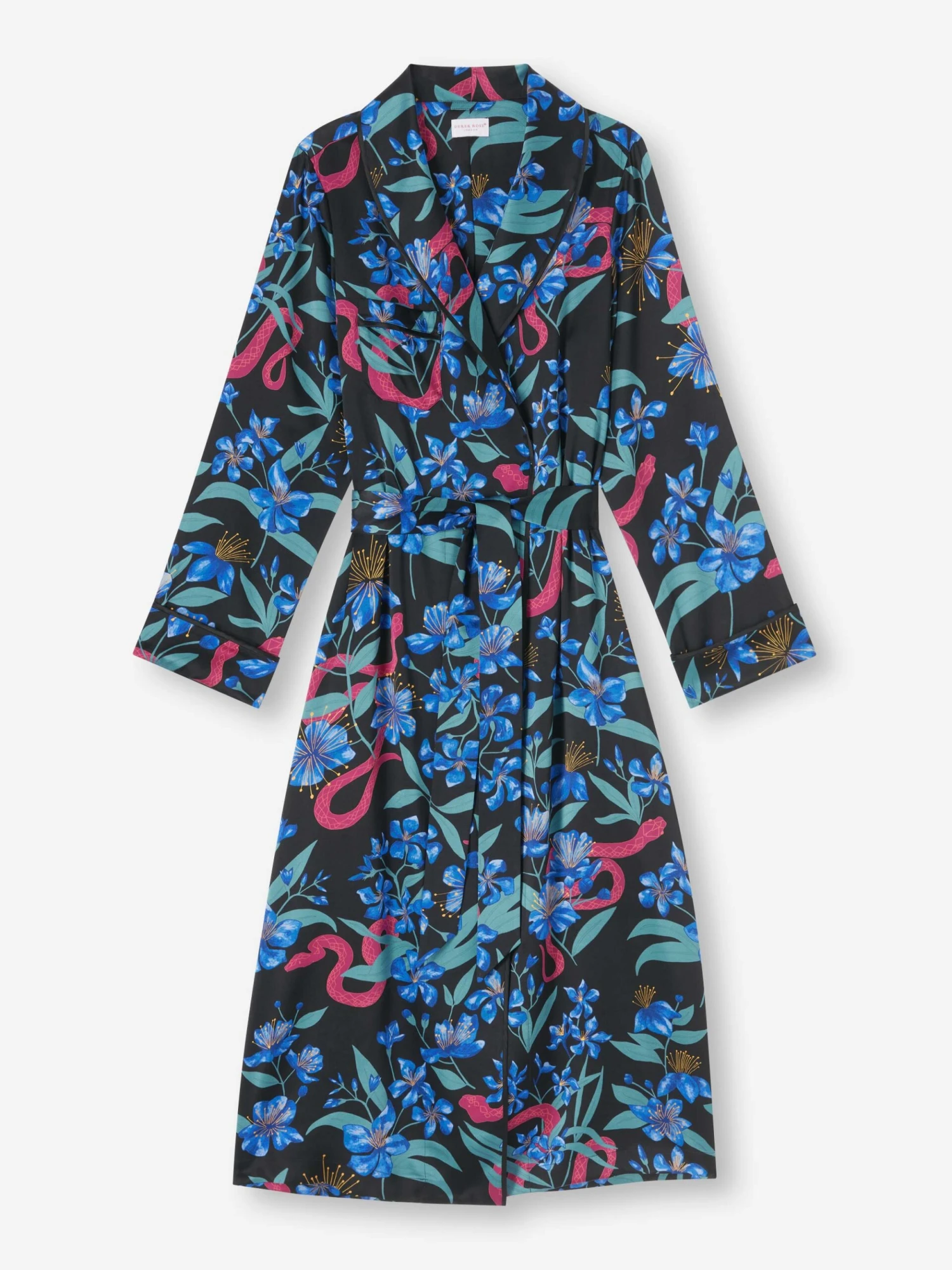 Just like our shorter versions, the mid-length gown style has a piped finish in complementary black, two hidden side-seam pockets and a waist-tie for an effortlessly stylish finish. Topped with a hand drawn print featuring native Moroccan flowers – Oleander and Myrtle, with bright snakes hidden among the plants.