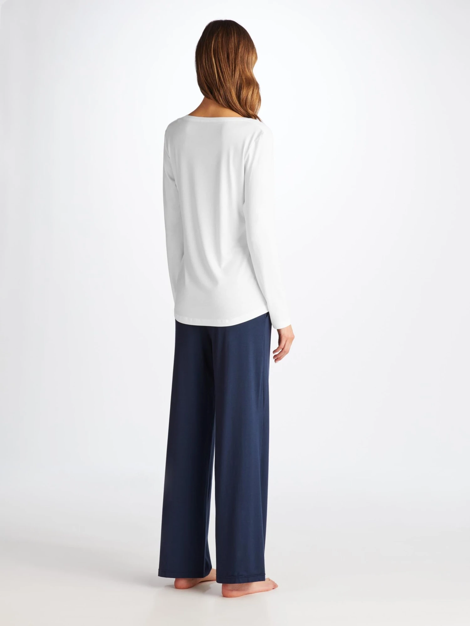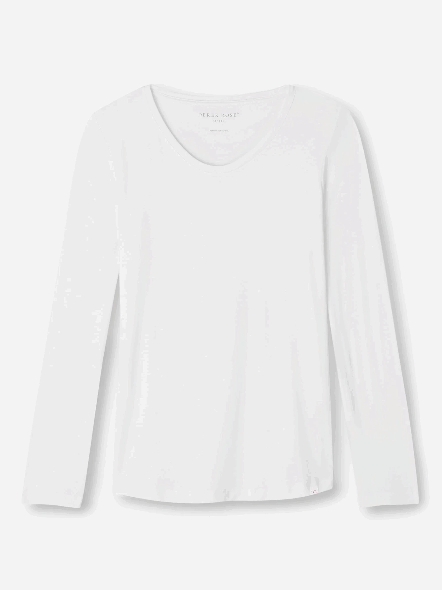 Our crisp white Lara long sleeve top has a relaxed but flattering shape with a curved, loose hem and offers a comfortable and natural fit allowing free movement. Fashioned from our signature soft micro modal which will retain its white colour wash after wash.