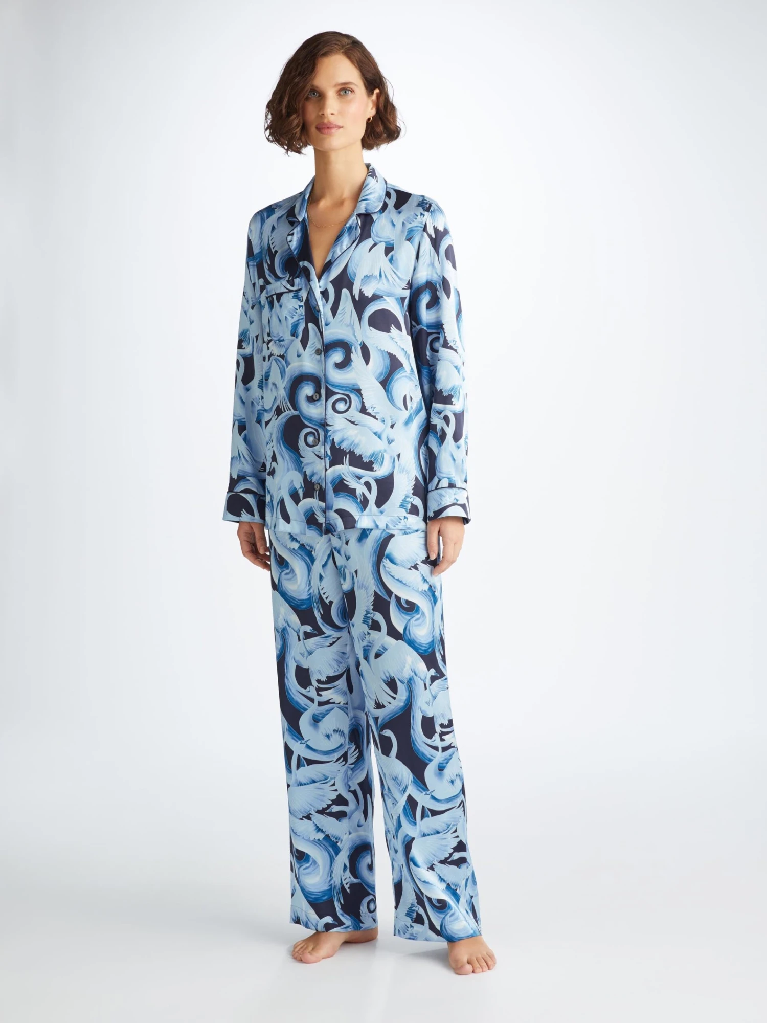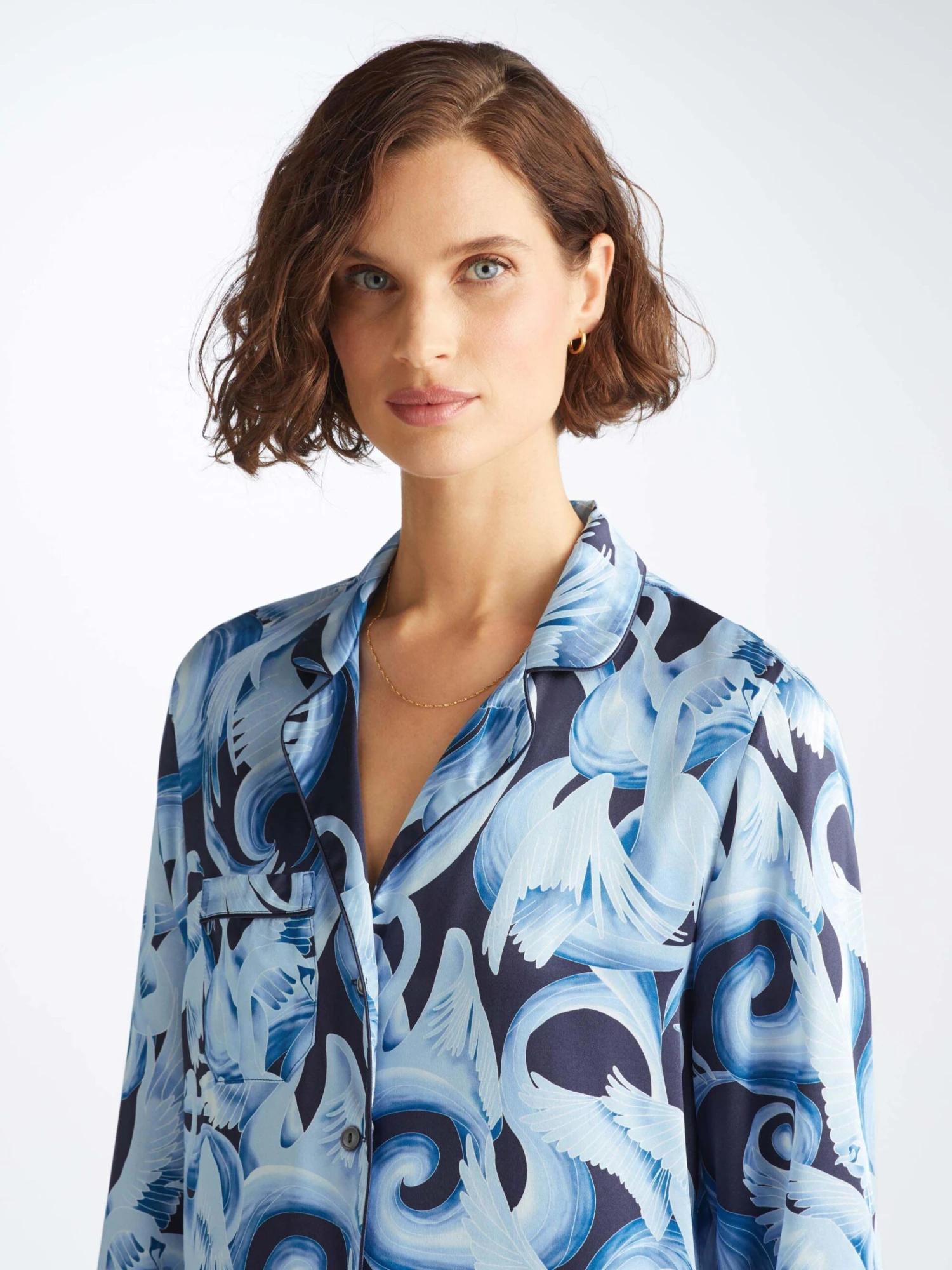 Produced in extremely limited quantities and the result of hours of loving craftwork by our skilled pattern cutters and seamstresses in our Cheshire, England workshop, this luxury navy pyjama set is cut delicately by hand to ensure we maintain the supremely soft and smooth navy satin finish.