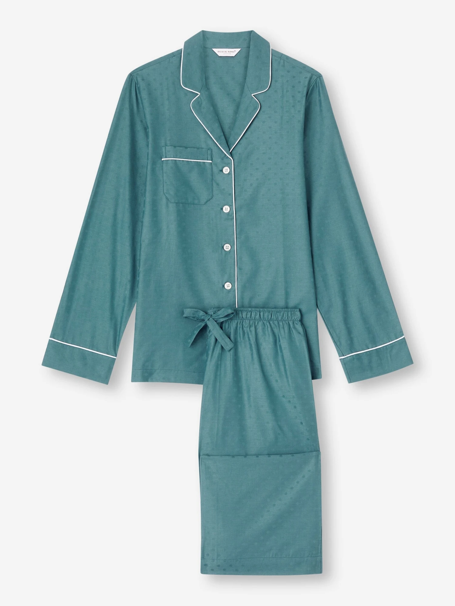 Made from our signature cotton jacquard – a luxuriously soft fabric, often mistaken for silk the jacket features a fully piped finish in a white, a single patch pocket and buttons. The quality of craftsmanship continues with the trousers and their elasticated waist with drawstrings for added comfort, whilst slip-in side pockets add a practical place to keep hands warm.