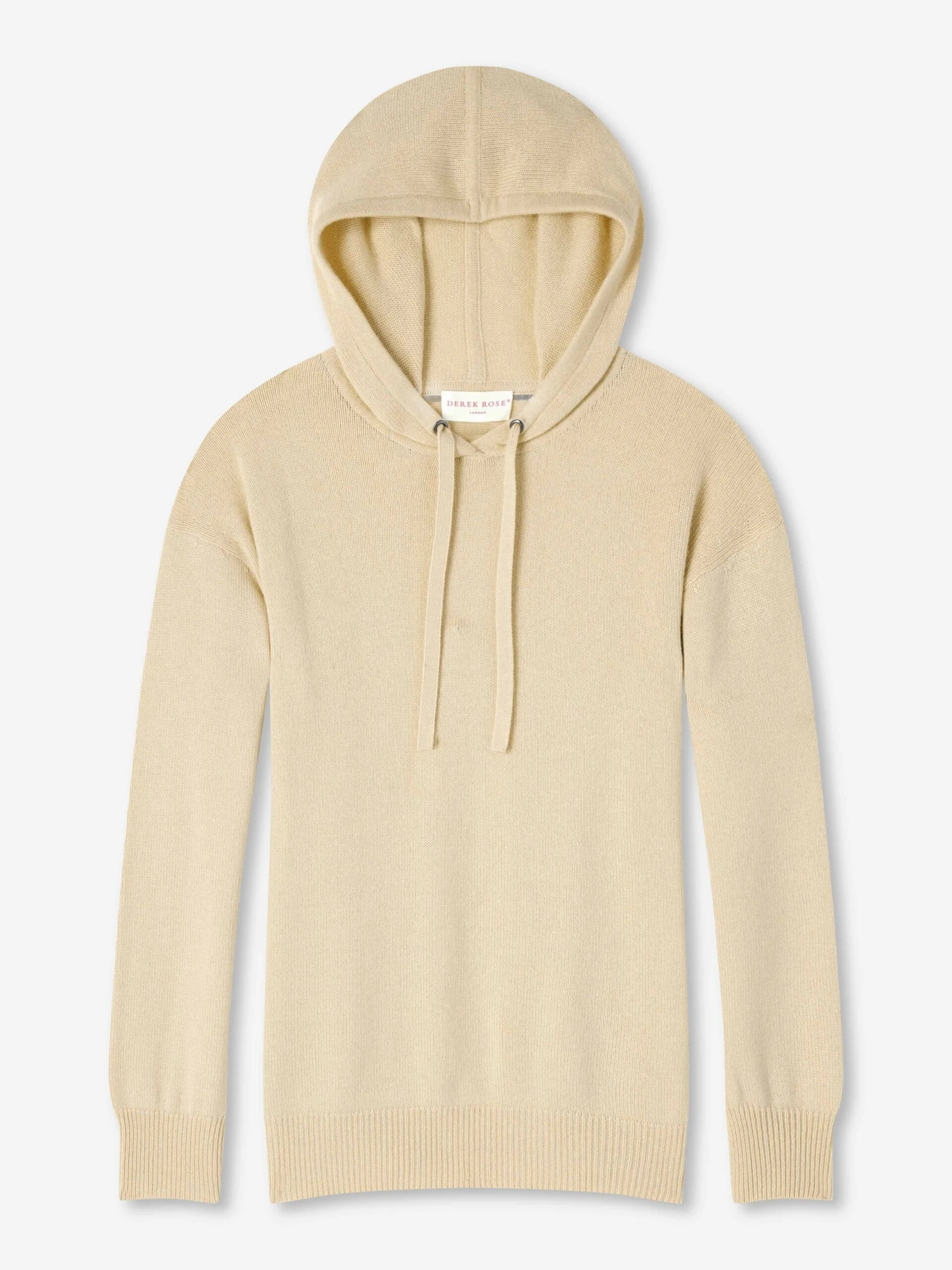 Our new Daphne women’s relaxed cashmere pullover hoodie in classic beige has a flattering but relaxed fit. With details such as dropped shoulders, ribbed cuffs and hem – for ease of movement, and a drawstring hood to keep you warm should you need it.