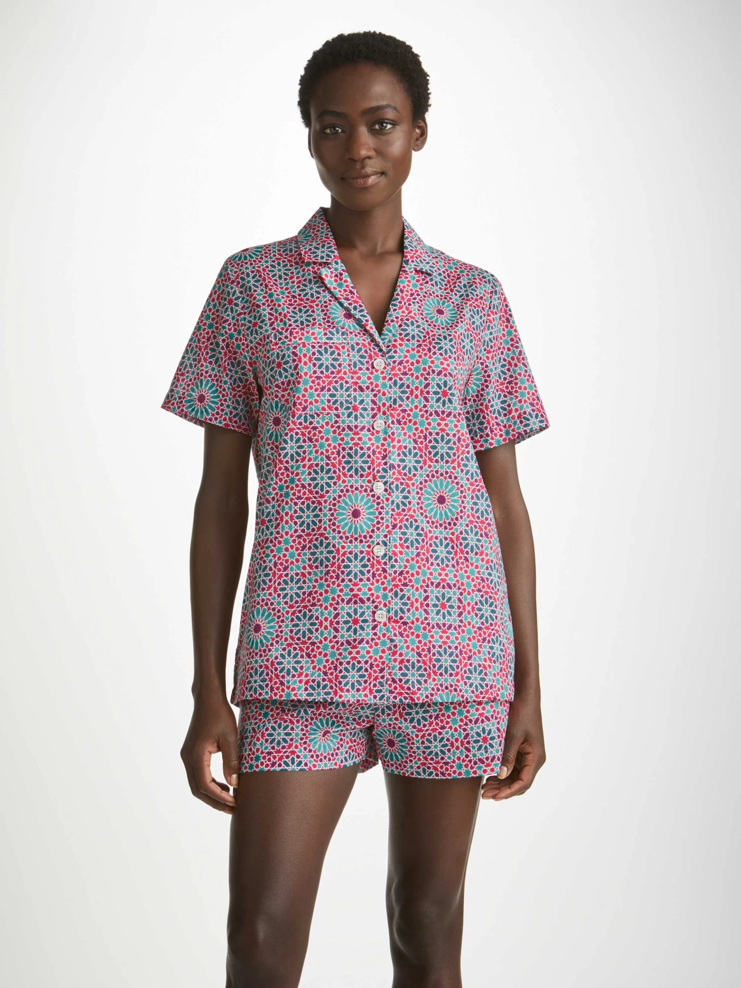 Cut with a flattering but relaxed shape, our women’s shortie pyjamas feature a short sleeve jacket top with a mitred corner chest pocket. The shorts have an elasticated and drawstring waist for practicality. The higher waist on the shorts creates a more natural fit and improved comfort, and the most important addition? Pockets!